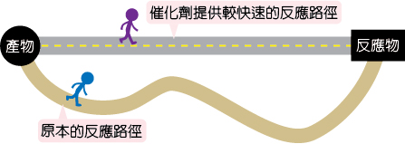 Q:常常聽到催化劑在某些化學反應中可以加快反應速率,但不會增加產物量的物質,到底催化劑在反應過程中作了什麼事情呢?