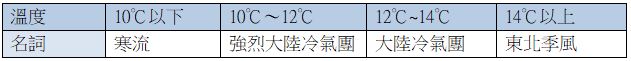 冷空氣來臨時,以中央氣象局臺北測站為標準,當臺北站出現10度以下低溫,即定義為寒流。我們可以用溫度區分如下: